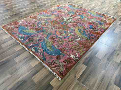 Pink Bird Motif Persian Rug: Hand-Knotted Oushak Wool Rug